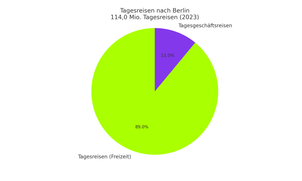 Die Daten verdeutlichen, dass Berlin sowohl für lokale als auch für auswärtige Tagesreisende eine wichtige Rolle spielt. Während Tagesausflügler*innen hauptsächlich aus Berlin selbst kommen, sind die Tagesgeschäftsreisenden verstärkt aus anderen Bundesländern vertreten.