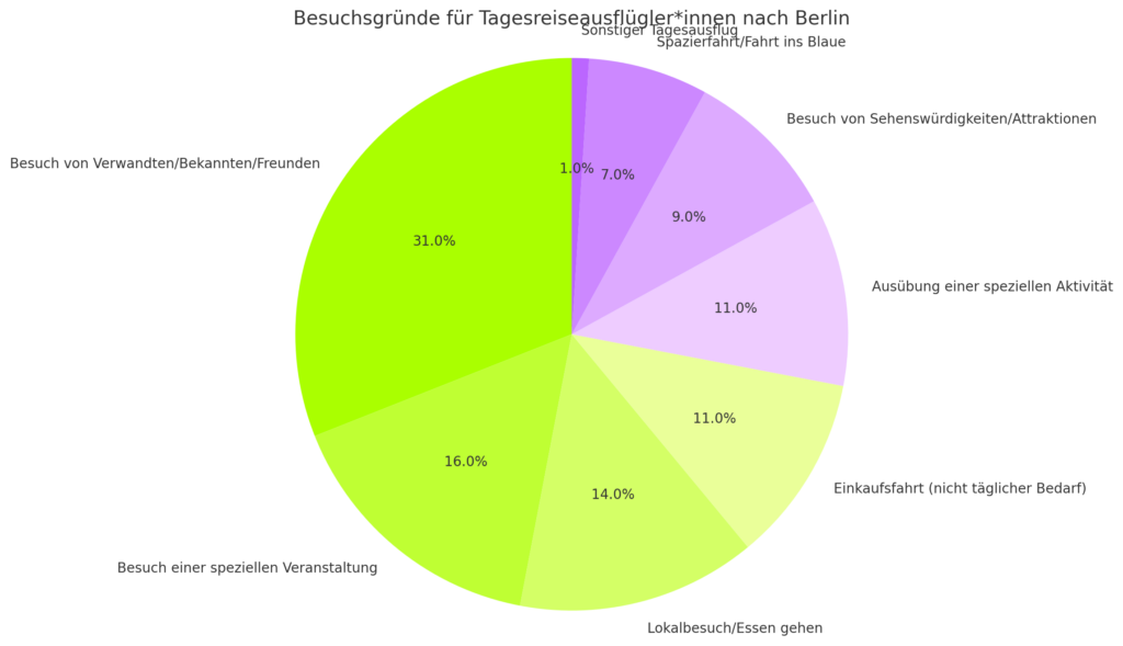 Der Besuch von Sehenswürdigkeiten und Attraktionen macht 9 % der Gründe aus, während 7 % der Reisenden Berlin für eine Spazierfahrt oder eine Fahrt ins Blaue aufsuchen. Sonstige Tagesausflüge runden die Liste mit einem geringen Anteil ab.
